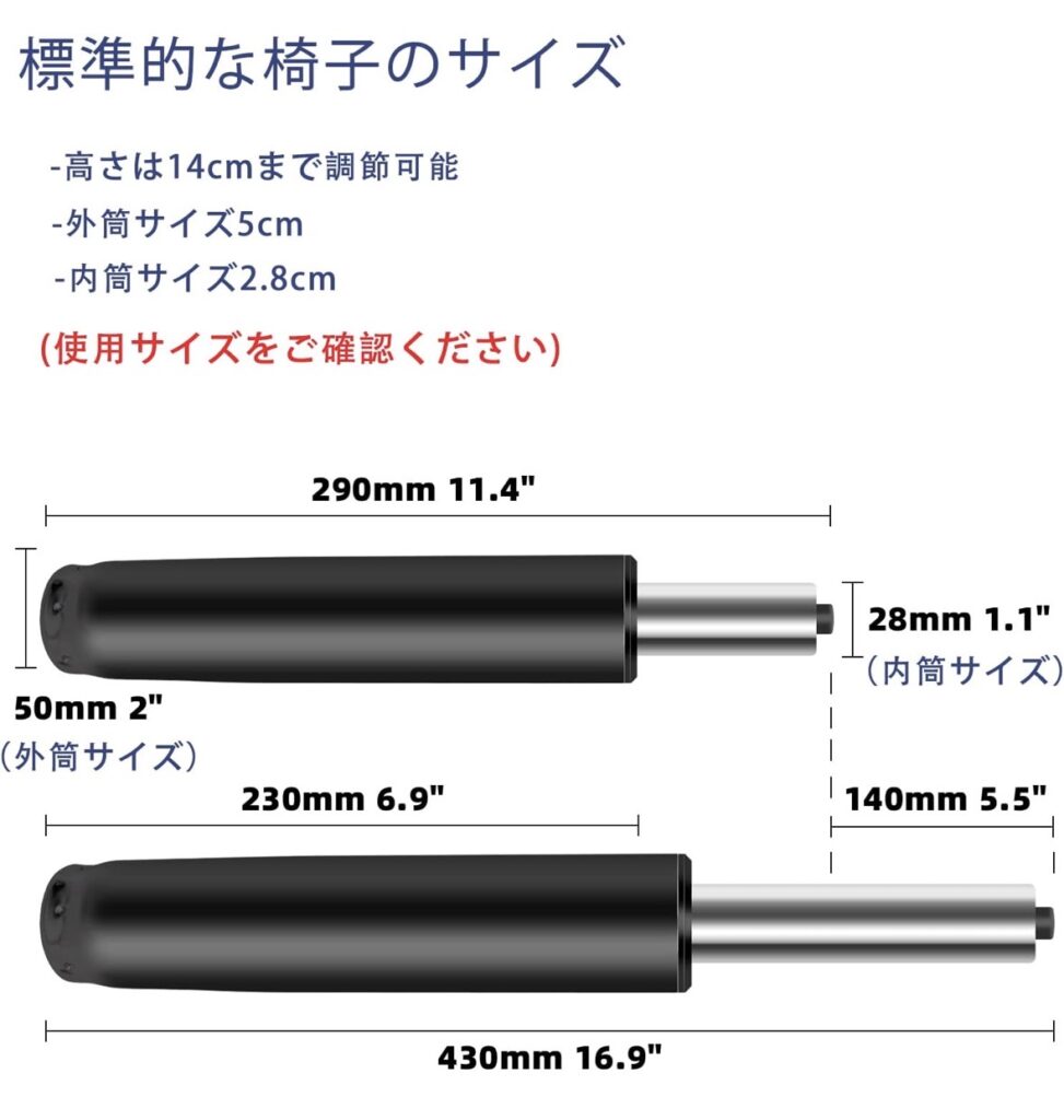 ガスシリンダーの購入は、現在の自分の椅子の高さを調べて、適合するものを選択します。